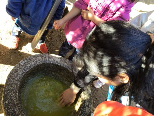 石臼に温かいお湯と温泉のもとを入れて、「手湯」の完成です。