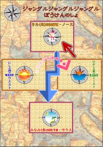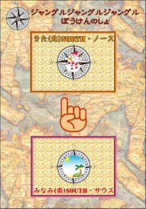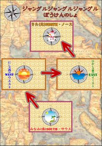 ②高難度のあそび方・・・【ぼうけんのしょ】カードを選んで、その指示にしたがって道しるべを進み、それそれの方角にある楽器を鳴らしながら進んでいく